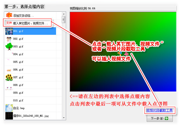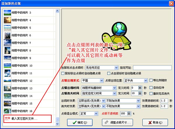 您既可以直接选择点缀图列表中的点缀图,也可以点击列表中的最后一项:“载入其它图片文件”载入其它任何图片、动画等作为点缀图。点缀图可以是您从网上搜索下载的各种图片,也可以是任何您拍摄、制作的相片、图像。
