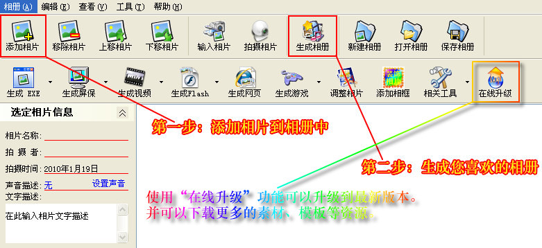 对于EXE、视频、Flash这三种格式的相册,它们各有各的特点,各有各的优点和缺点,下面分别介绍一下这三种格式,您可以通过下面的介绍,根据您的实际需要选择您生成的格式。