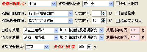 如上图的设置,点缀出现时会从左上角移入,并且在移入的同时会沿X轴旋转并且会从完全透明到完全显示逐渐渐变。