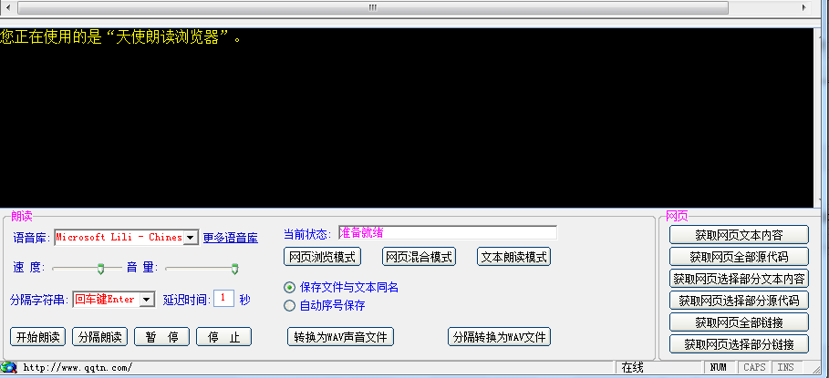 点击网页朗读之后,浏览器下方会出现您正在使用的是“天使浏览器”,下面就是朗读相关属性的设置: