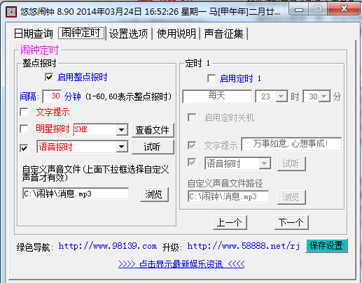 悠悠闹钟是款用来日期查询、闹钟定时的实用小工具,日期查询可以查询公历日期、农历日期、属相、星座,还可以Internet对时,闹钟定时可以设置整点报时、每天定时、明星报时,精心设计,完美报时。