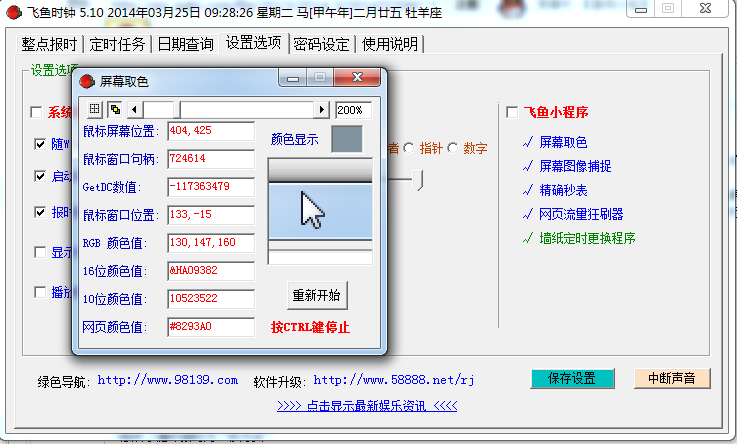 飞鱼多功能时钟是一款智能化多功能的桌面时钟工具,时钟可以在桌面最前端显示,点击时钟就会出现软件的主界面,软件可以设置整点报时、定时任务、日期查询等功能,还可以查看电脑系统启动的时间和系统运行的时间,软件还自带屏幕取色,屏幕图像捕捉、精准秒表、网页流量狂刷器、墙纸定时更换程序等附加功能。