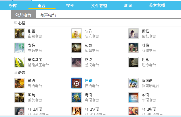公共电台界面,心情类电台、语言类电台、年代、流派、地点。