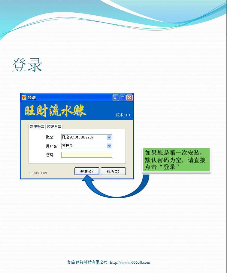 1.在第一次使用的时候会提示创建账套,请输入账套名后点确定按钮,创建成功后,默认帐套管理员登录密码为空,直接点登录即可。