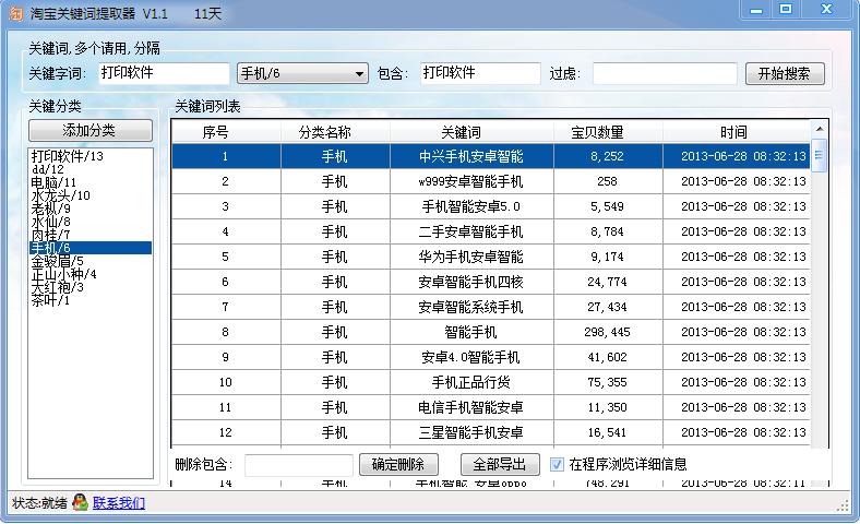 淘宝关键词提取器是一款通过关键词来提取用户搜索相关关键词,可以不断的读取选择关键词,来挖掘出更多关键词,还能提取关键词宝贝相关信息,宝贝分类名称、关键词、宝贝数量等信息,是淘宝卖家优化自己店铺宝贝关键词的必备工具。