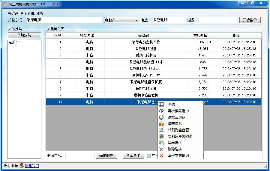 8、可以右击选择某个关键词,查看淘宝指数、读取宝贝数、转到淘宝网查看、再次读取关键词、复制、删除。