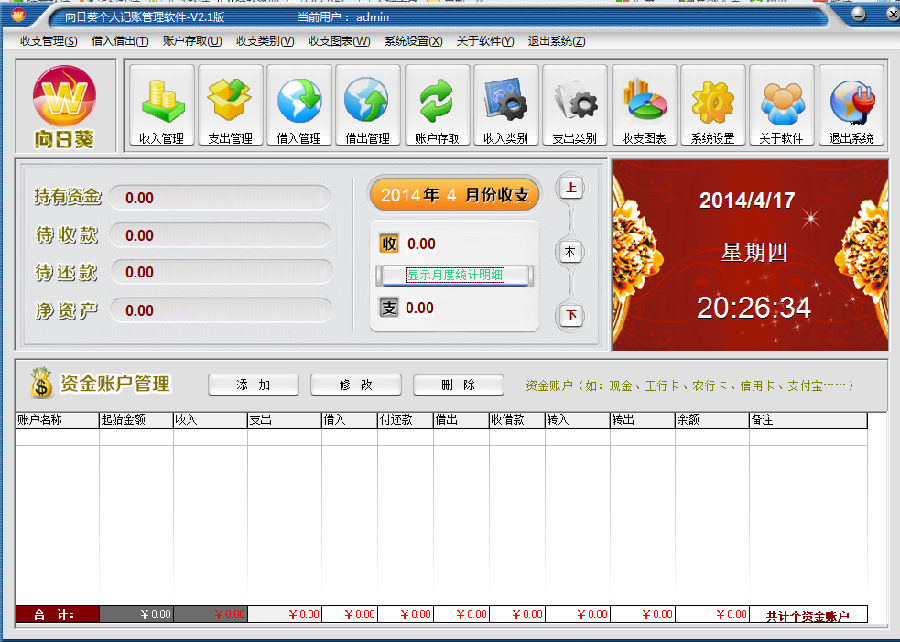 向日葵个人财务记账管理是一款专门面向个人财务管理而开发一款免费财务软件,软件对于收入支出、借入借出、账户存取都有一个很详细的管理方案,每天的收入支出都有很详细的报表,非常适合个人或者家庭用于日常的财务管理。