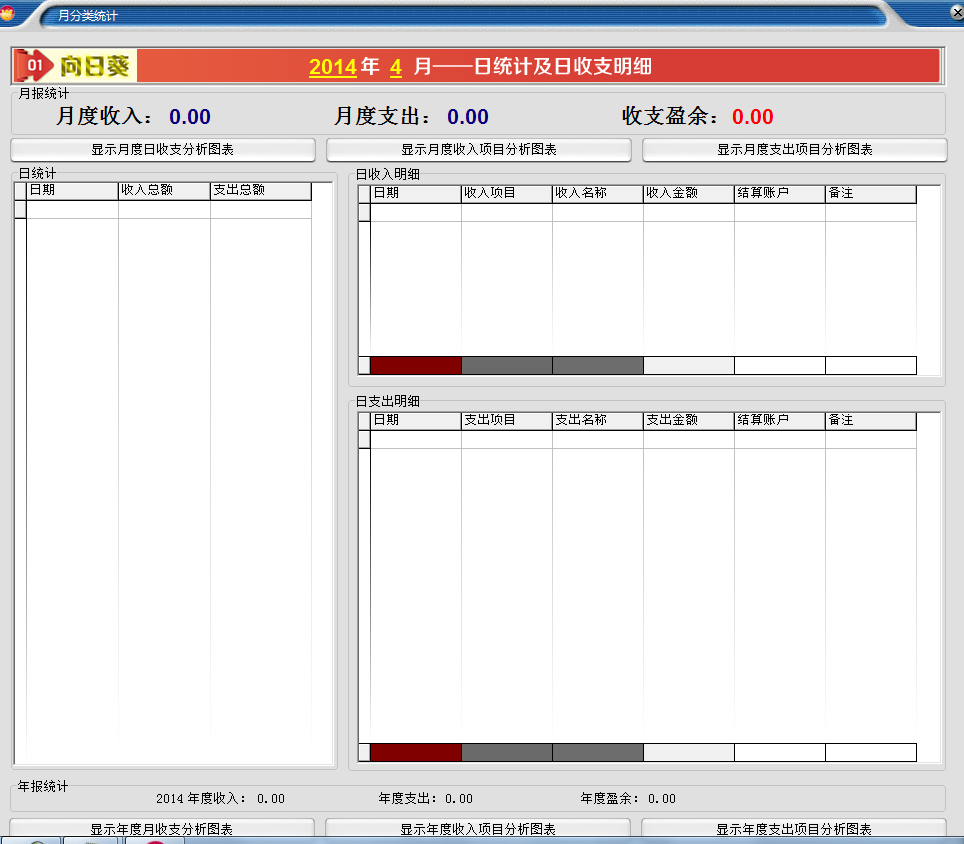 最直接的,软件主界面上有“显示月度统计明细”(2.1版新增“收支图表”直观显示分析数据)按钮,点一下,一年或一个月总计收了多少钱,花了多少钱,每天收了多少花了多少,以及某天收支都详详细细,分类显示。如果要查看之前月份或年份的收支记录,软件主界面上有“上”“本”“下”,上:即上一个月,可连续点击向上查看;“本”:直接回到当前月份收支的显示,下:即下一个月,只有当之前使用了“上”月查询功能才能使用向“下”月查询。因为本月的下个月收支还没产生呢。