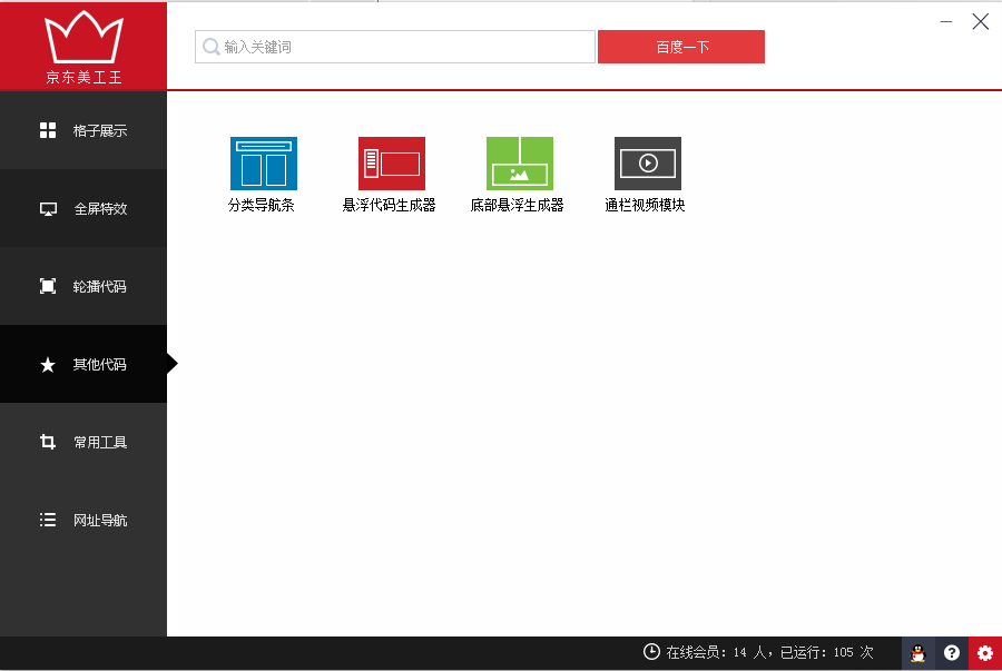 京东美工王是一款基于京东商城的京东店铺装修专用软件,在店铺装修生成专用的特效代码,能生成京东装修市场常见的Css+Js特效模块代码。本软件是一款绿色软件,无需安装,也不会在京东美工王文件夹外保存任何数据。一切京东美工王的数据都保存在京东美工王目录下,如需卸载,只需直接删除京东美工王目录即可。