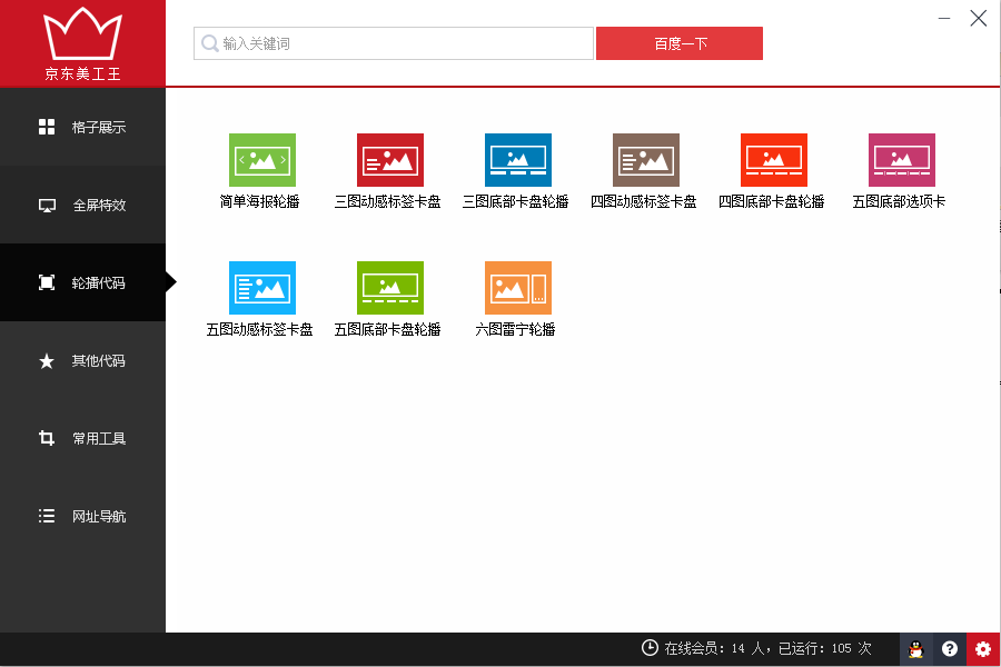1、软件能生成全屏装修代码、固定背景代码、全屏海报、反暗亮模块、悬停切图、卡盘轮播、缩略图轮播、滚动轮播、底部卡盘轮播、右侧卡盘轮播、多图格子轮播、多图宝贝秀、方块导航轮播、等近百种特效代码。