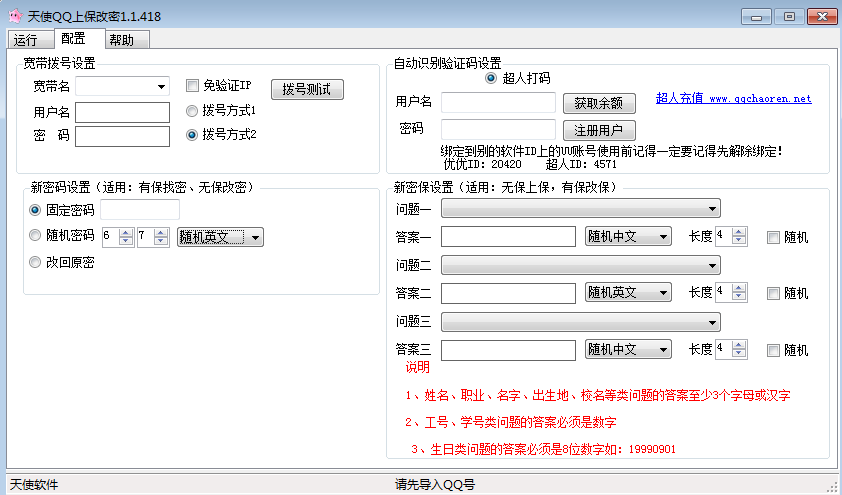 天使QQ上保改密是一款大量QQ批量上保改密的软件,软件支持有保上保、有保改密、有保改保、无保改密、过防沉迷,是一款QQ号码综合安全管理工具,对于大批量号码上保、改保、改密都有很大的帮助。