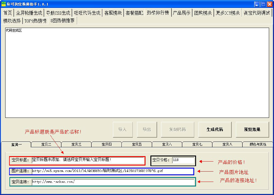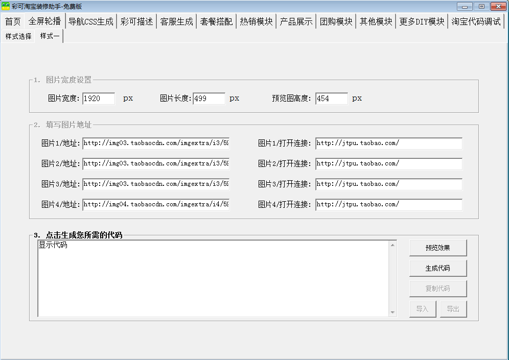 第九:我们看看效果!你会看到没有显示你放的图片,到这里了,你不要怀疑生成的代码不能用哦!这生成的图片是淘宝加载图来的,默认显示的是淘宝加载图!我们进入第十步就能完全看到效果了!