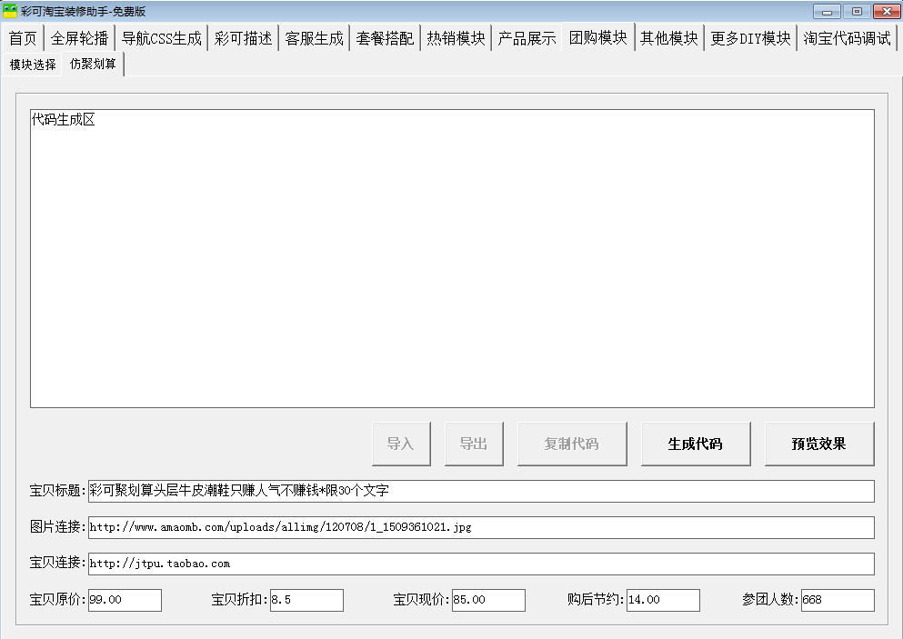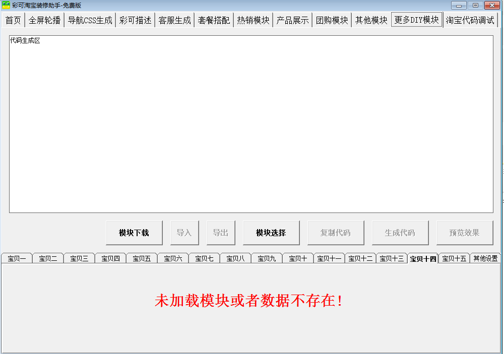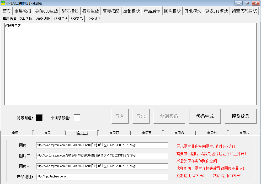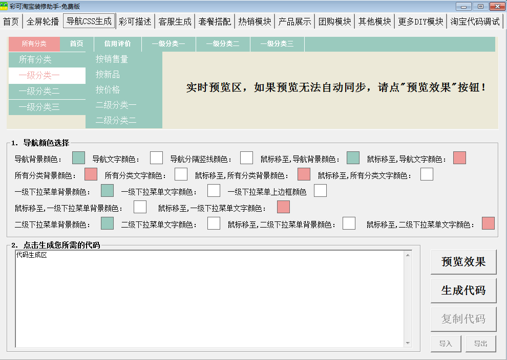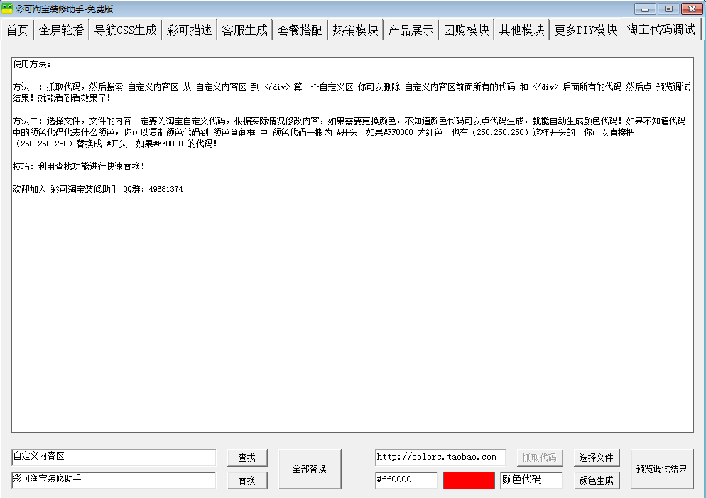 彩可淘宝装修助手是一款免费使用的用来淘宝店铺装修生成代码的工具,软件除了生成常见装修代码之外,比如全屏轮播、导航CSS、客服代码等,还提供许多实用的功能,实用工具,快递查询、计算器;图片处理,PS在线、美图秀秀、上传图片;淘宝大学,开店流程、店铺设置、搜索排名,等等多种实用的信息来帮助用户全方位打造淘宝店铺。