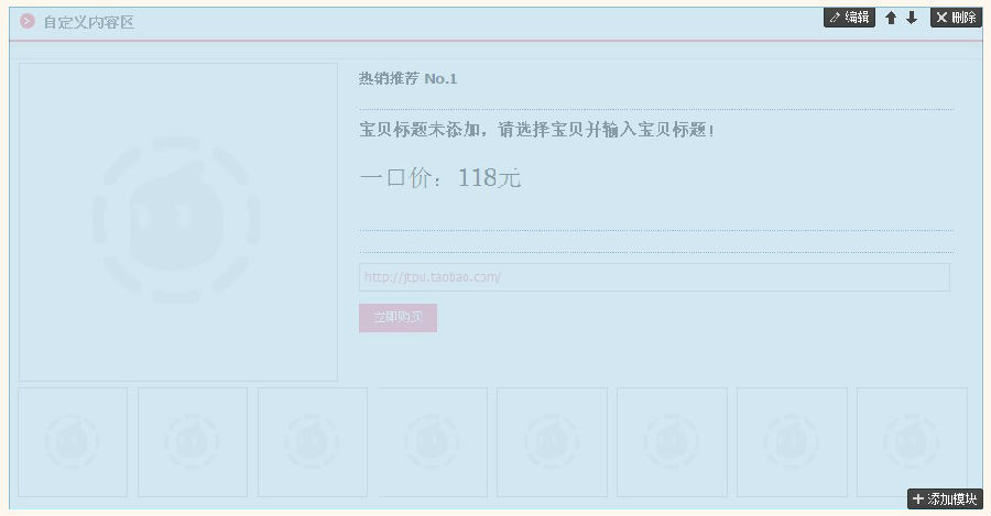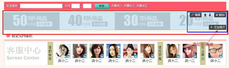 第六:打开卖家中心,店铺装修,进入店铺装修后,鼠标放在950模块上,你就能看到添加模块字样了!