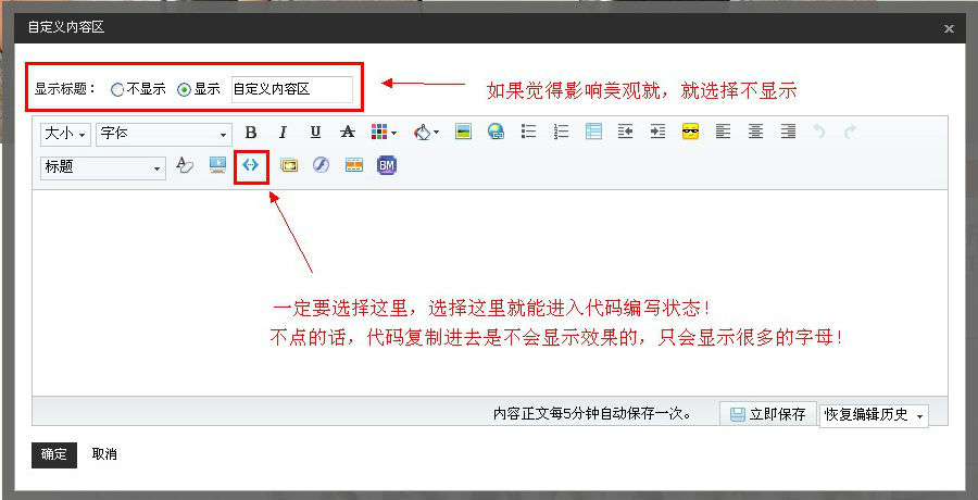 这里注意了,一定要点源码,才能进入代码编辑状态,很多新手不知道源码按钮在那,源码按钮就是[ 〈…〉] 这符号按钮了,点了之后把刚才生成的代码复制进去!然后点确定!
