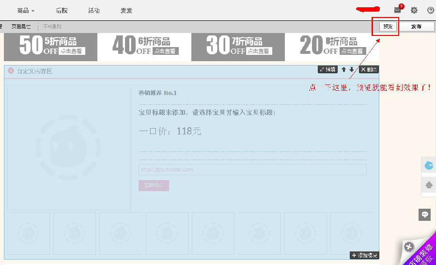第四:编辑好后,我们点一下预览效果看看是不是我们要的效果,这里预览的效果,和我们发布的效果是一样,测试后再复制到自己的网店模块中就行了!