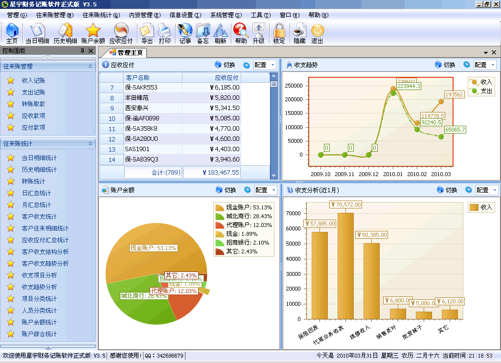 (1)、管理主页报表: 在一张报表中同时显示当前的应收应付,账户余额,收支趋势图,收支分析图,您只要打开软件,就能首先看到这些您最关心的数据统计表。
