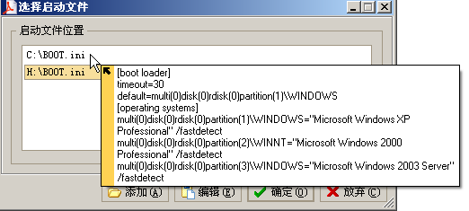3、带了个简易的“文本编辑器”-用于编辑 BOOT.INI。因为在 98/2000/XP/2003 中 BOOT.INI 往往是“只读、系统、隐藏”的文件,在编辑时必须“显示系统文件”,且去掉相关的属性才能编辑保存,操作非常的不便。而“文本编辑器”在“保存”时会自动去掉原来的属性,是之可以正常的编辑,在保存后再恢复其原来的属性。