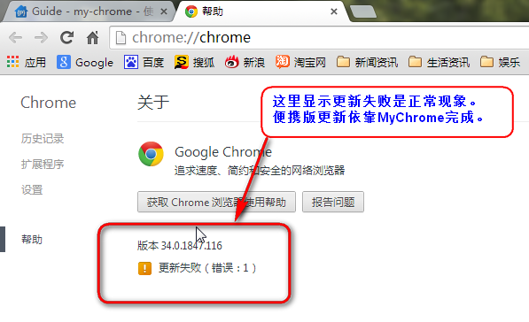 浏览器更新后,在“关于 Google Chrome”界面中仍显示类似“更新失败“这样的信息属正常现象。便携版 Chrome 更新依靠 MyChrome 来完成。