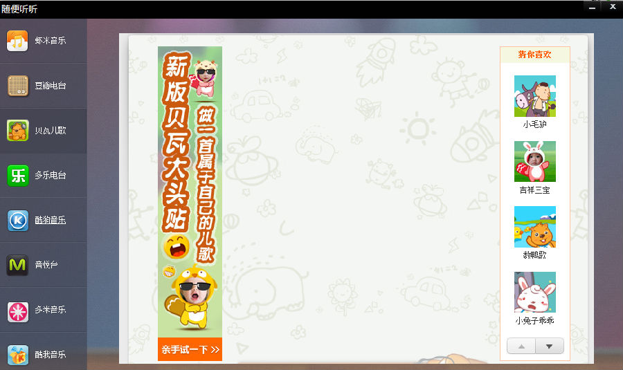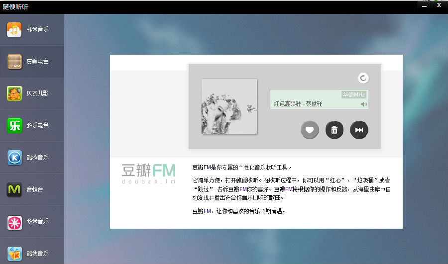 随便听听是一款在线音乐试听播放器,播放器界面精美、运行稳定,集合了虾米、豆瓣、多米、酷狗等多款音乐播放器于一体,所有音乐数据全部同步,音乐随心听,播放器任意切换,真正打造一个属于自己的全能音乐播放器。