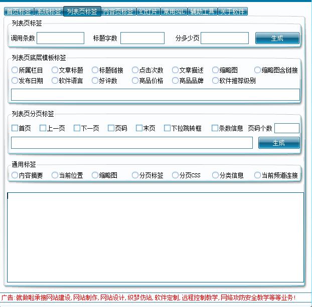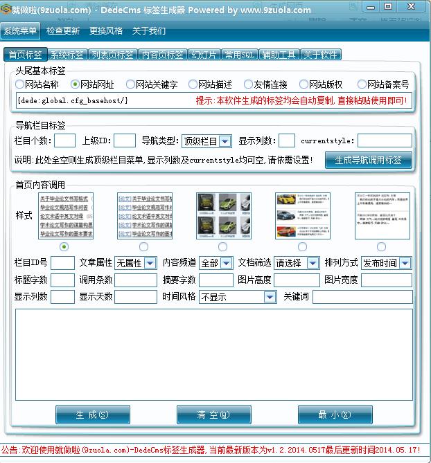 DEDECMS标签生成器是一款方便各位站长使用织梦程序仿站时使用,工具集合了所有dedecms标签,通过网站各部分标签进行分类,所有的标签可以直接点击生成,就可以拿来调用。对于那些刚接触仿站的用户非常实用,不熟悉标签、记不住标签都可以使用这款标签工具。非常的方便,工具界面风格还支持自定义更换。