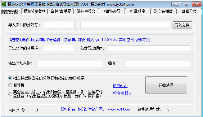精英txt文本整理工具箱是个多功能的综合文本管理工具,提供了多个文本操作的功能,分割提取替换,合并去重复,筛选中英文,打乱文本顺序,汉字转拼音,邮箱分类等等,可以将各类常用的数据保存到文本里面,使用这款文本整理工具箱进行不同需求的操作,方便实用,能够大大提高你的整理效率。