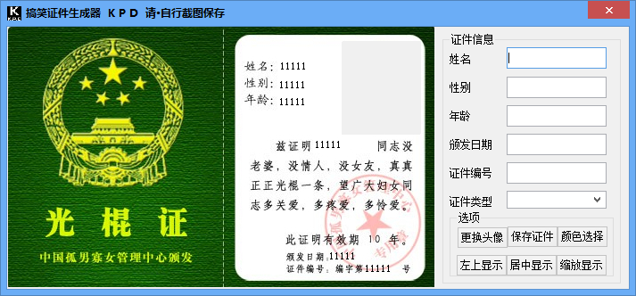 KPD表情自定义生成器是一款用来生成各种表情的一款工具,可以自定义表情图片和文字内容,制作个性的表情。软件还提供各种恶搞图片制作功能,如搞笑证件、举牌照等等。非常的好玩!