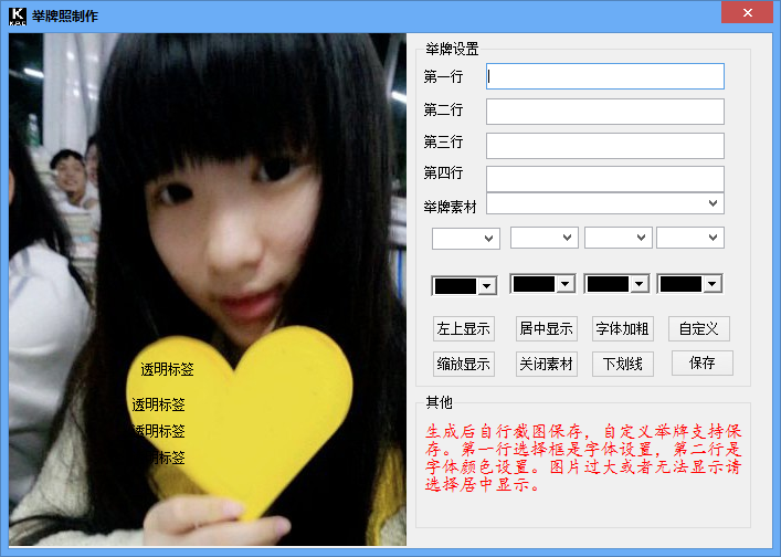 1、软件经过修复,功能也比较多,有自定义,自定义表情图片,四行文字,鼠标拖拽移动文字,还有举牌制作,素材有61个,表情图片素材有30个,