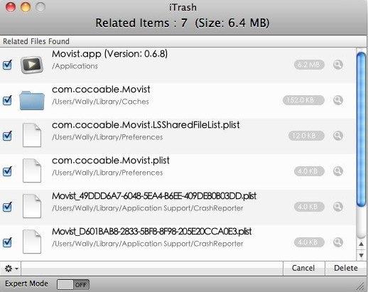 trash会帮你搜索与此要删除软件相关的文件. 可以看到主程序是6.2mb 散碎文件0.2mb ,如果您对系统文件稍微了解可以大概看一下要删除的文件是否正确然后点击删除即可。