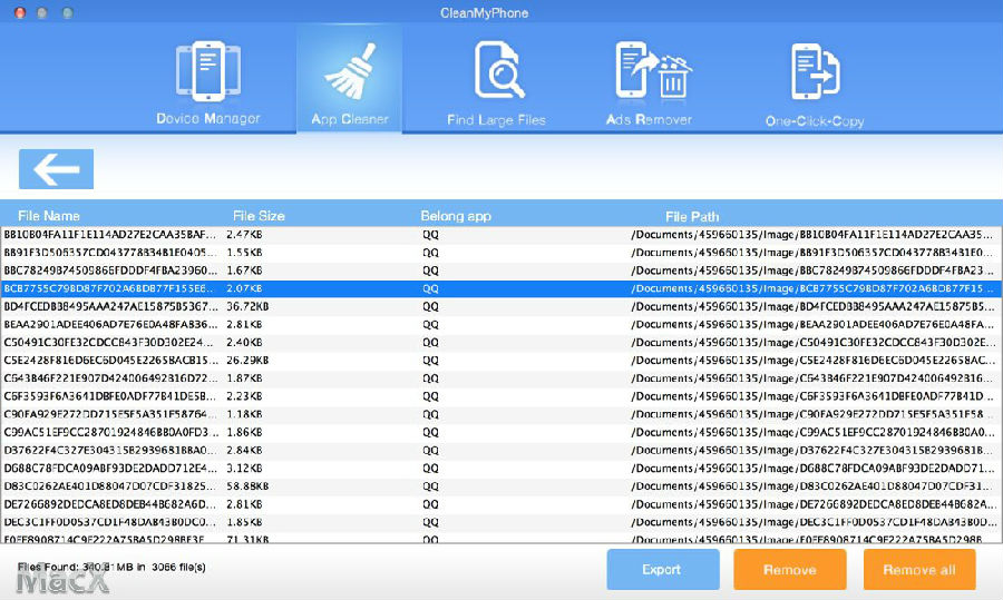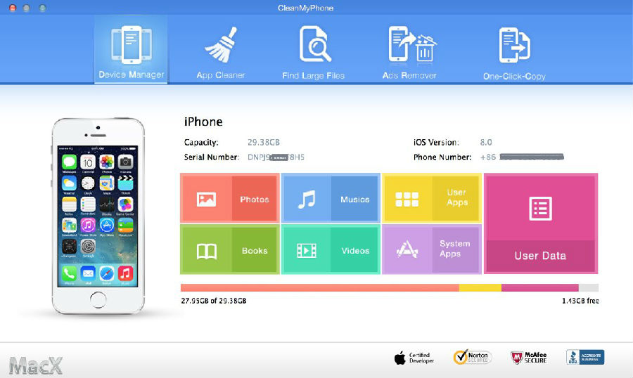 CleanMyPhone for Mac是款苹果电脑垃圾文件清理实用性很强的工具,还支持磁盘管理、应用卸载、删除文档数据、查找大文件等功能,CleanMyPhone的磁盘管理器可以帮助到你的iPhone ,iPad或iPod touch的配置清洁和顺利运行。,组织和管理文件和应用程序。你可以找出究竟占用你的磁盘空间并轻松导出,删除不需要的文件,或汇出,并从您的设备卸载不必要的应用程序。 回收存储空间,并保持您的iDevice运行平稳... CleanMyPhone应用程序清洁器可以帮助你去除像文档和数据,应用程序的Cookie各种临时和无用文件获得更多的存储空间,并在iOS设备上应用程序垃圾文件。