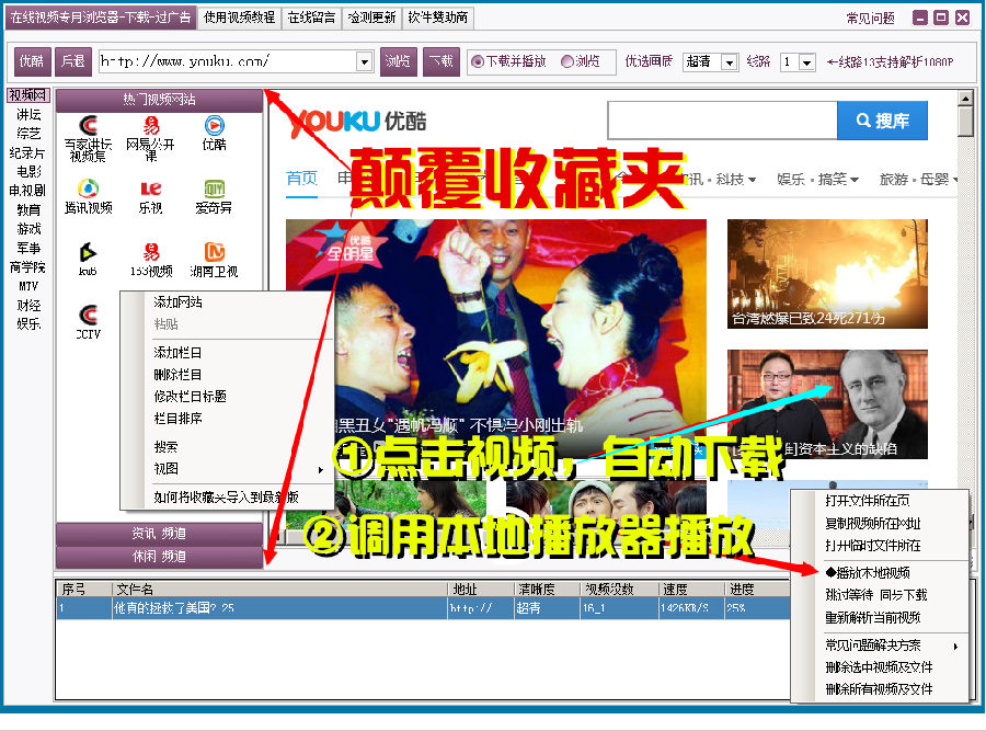 在线视频专用浏览器用于各大视频网站在线观看视频下载视频时使用。软件主要功能是能够将各大视频网站上面的视频免费下载到本地,会自动调用本地播放器进行播放。稳定去广告,支持多个主流视频网站。