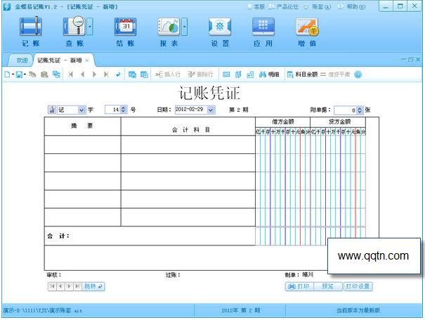 记账:采用通用会计凭证格式,集成最新会计科目,轻松、快速新建凭证。