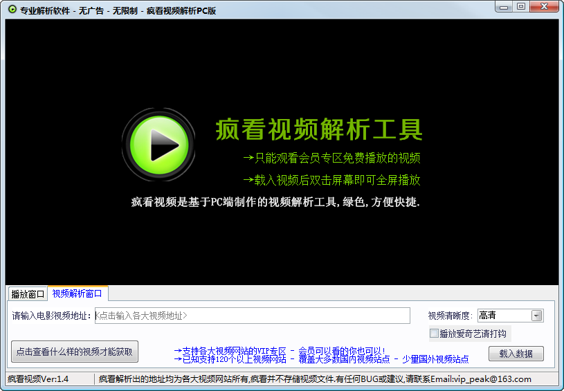 疯看视频解析工具是一款最新可用的视频解析同居,本工具不同于同类型其他视频解析工具,疯看视频是一款专门用来解析视频网站付费视频的工具。像主流的优酷土豆、爱奇艺、乐视、搜狐、腾讯等视频网站,都会有其VIP付费视频专区。本工具就能帮你免费破解会员专区视频,免费观看。软件完全免费、绿色无毒,方便快捷,是看片好帮手!