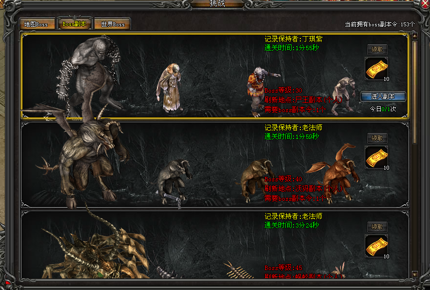 野外BOSS抢不过?没关系,你可以在BOSS副本中单人挑战这些强力怪物。BOSS副本中的怪物比野外版的稍弱,但是奖励同样丰富,每天只有一次挑战机会,千万不要错过哦。