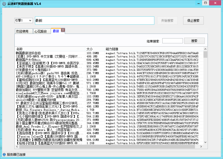 云速BT资源搜索器免费分享BT种子资源搜索,大家都懂的!各位就不用担心找不到片了!可以搜索BT种子、磁力链接、ed2k等多种类型资源。软件采用多线程搜索引擎,以最快的方式搜索出最新资源。搜到的资源可以迅雷、旋风下载或是直接进行在线云点播。随你喜欢,让你一次看个够!