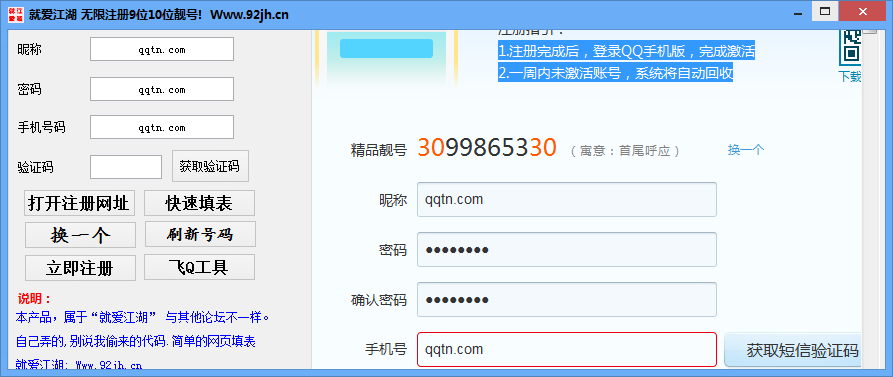 QQ精品靓号无限注册机帮助你无限制批量注册9位/10位QQ精品靓号。最近腾讯开放QQ靓号注册,所有用户都能免费获取到QQ靓号。很多用户都开始大量注册靓号储备。本款QQ精品靓号无限注册机集成飞Q手机验证码接收工具、一键网页填表等多项功能于一体,旨在帮助用户快速注册多个QQ精品靓号。