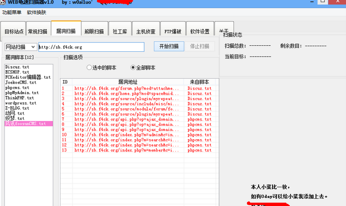 《web龟速扫描器》是一款可以轻松进行web安全测试,挖漏洞的利用工具。《web龟速扫描器》能够自动检测本地或远程主机安全弱点的程序,它能够快速的准确的发现扫描目标存在的漏洞并提供给使用者扫描结果。工作原理是扫描器向目标计算机发送数据包,然后根据对方反馈的信息来判断对方的操作系统类型、开发端口、提供的服务等敏感信息。