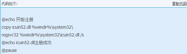 通过脚本之家下载dll的朋友,可将下面的代码保存为“注册.bat“,放到dll文件同级目录(只要在同一个文件夹里面有这两个文件即可),双击注册.bat,就会自动完成icuin52.dll注册(win98不支持)。