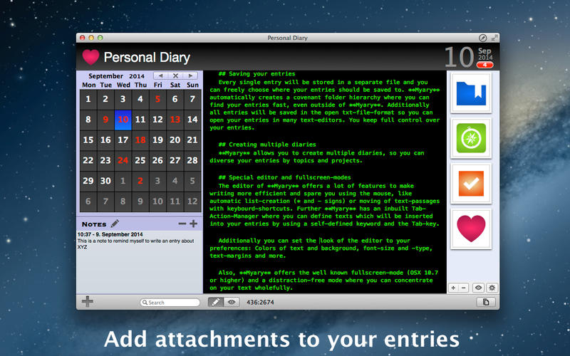 2、特殊的编辑器和全屏-模式。 Myary的编辑器提供了很多功能,使书写更高效,使用鼠标,如自动列表创建(*和 - 符号)饶你或文本的段落移动与键盘快捷键。此外,您可以设置编辑您的喜好的外观:文本和背景,字体大小和型,文字的利润率和更多的颜色。此外,Myary提供众所周知的全屏模式(OS X 10.7狮子和10.8山狮)和分心,自由模式,你可以专注于你的文字全。