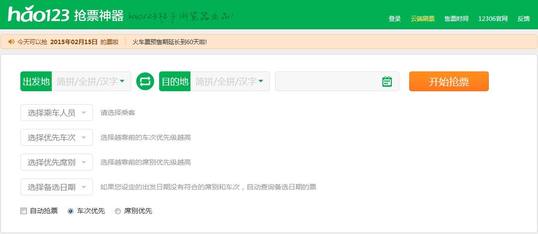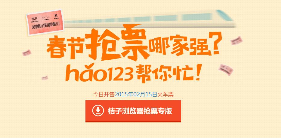 这几天2015年春运抢票大战已经进入白热化状态。各家都推出了春运抢票神器。桔子浏览器也推出了hao123桔子浏览器抢票专版,全网抢票速度最快,成功率最高,提前60天帮你开抢火车票。桔子浏览器抢票专版拥有全自动填写验证码、云端离线刷票、百台服务器强力支持等强大功能,助力春运抢票。