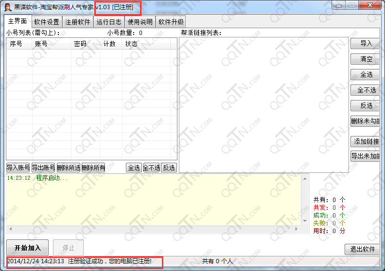 软件主界面:小号列表、帮派链接列表、加入帮派操作