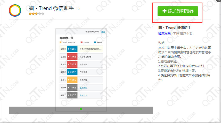 圈Trend 微信助手是一款基于圈平台开发的浏览器插件,主要用于微信公众平台管理使用,查看发布计划、发布任务管理和素材管理等作用。一款非常方便的圈平台辅助应用,欢迎下载。