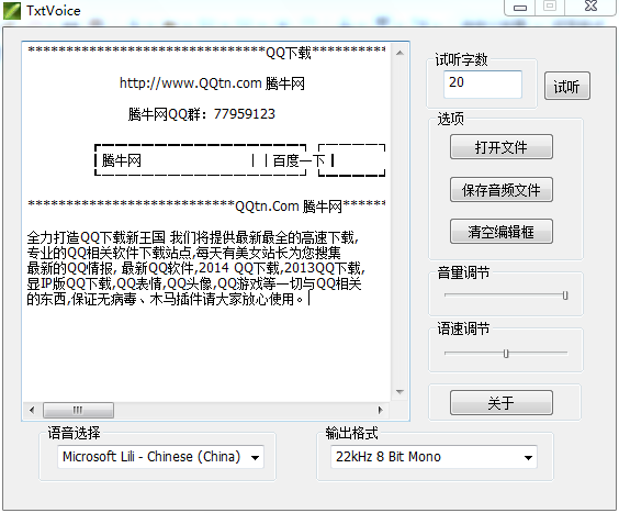 Txtvoice,一款免费的文本转语音软件,软件支持中英文文本识别和语音转换。可以用来将文本小说转换成有声小说、将一些文字通知转换成语音通知。转换之后,可以保存为常见的音频格式,可以用电脑播放、可以存放到手机、MP3播放。