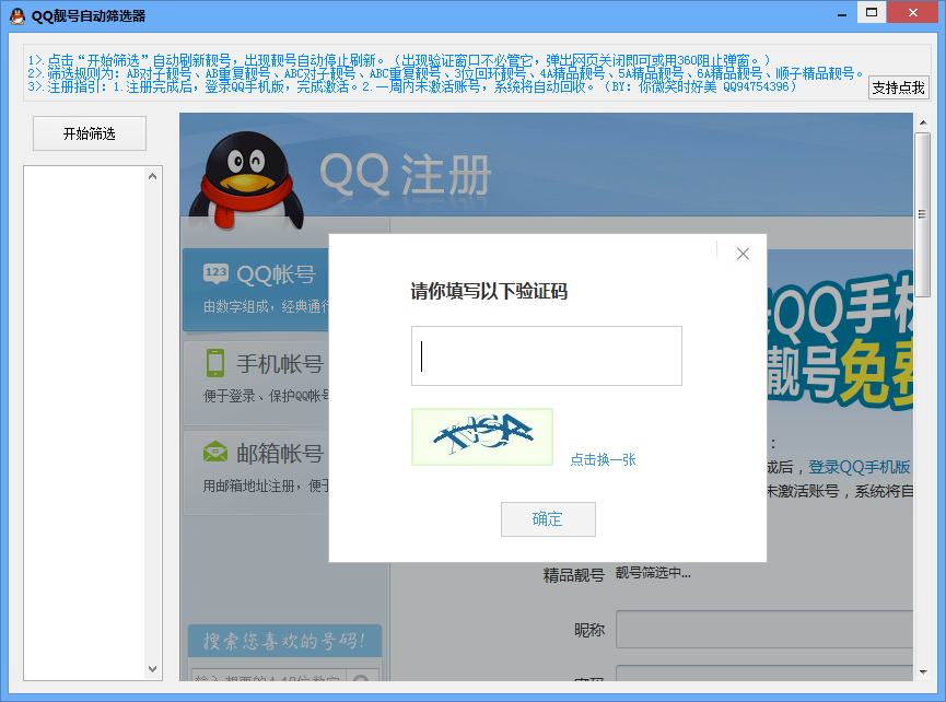 QQ靓号筛选器,自动刷新QQ注册页面,当页出现靓号时自动停止刷新,用户可以完成靓号注册。能够完全取代人工手动刷新,更方便、效率更高。