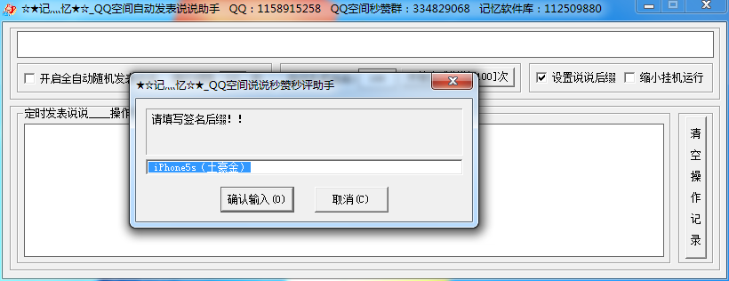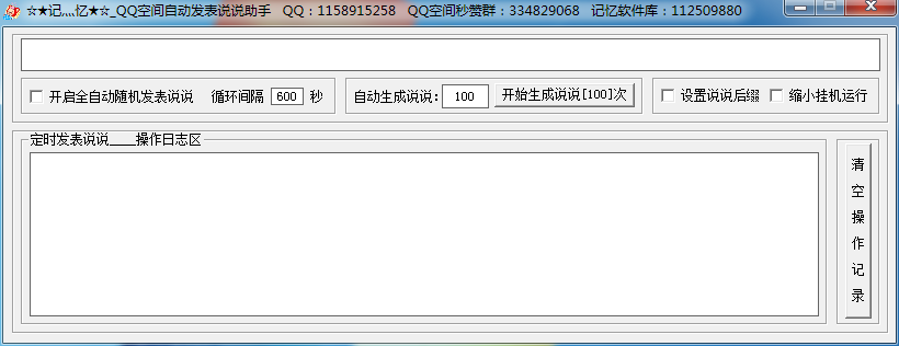 记忆出品,QQ空间说说自动发表助手,开启软件可以实现全自动发表随机说说,实现打造人气QQ空间的目的。同时还可以设置说说后缀。