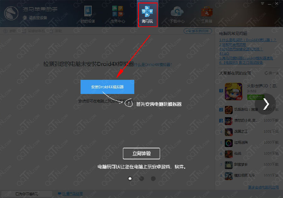 海马玩4.0版是海马苹果助手和Droid4X(安卓模拟器)的结合体,本版本不仅支持iPhone、iPad设备的管理、下载,还增加的安卓设备的管理、下载,另外还能在电脑上玩安卓软件、游戏,并保留了强大的工具箱功能!