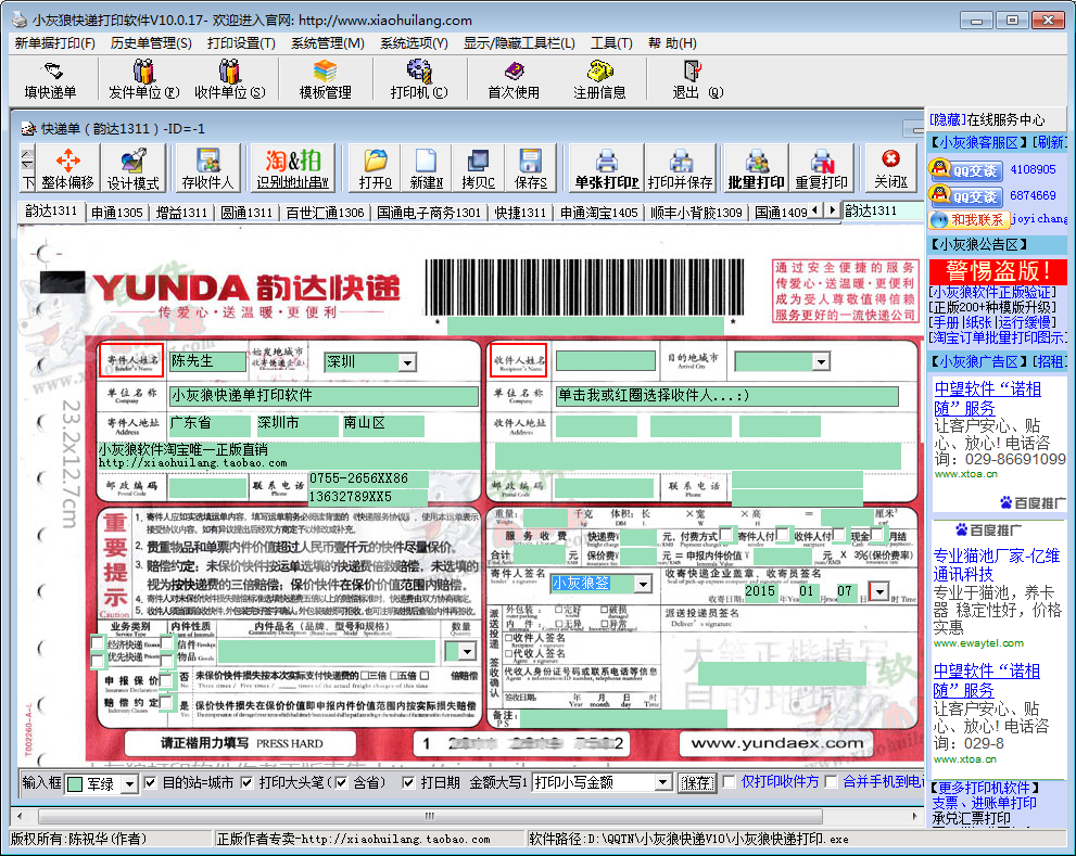 顺丰(国内国际)、全峰、申通、申通淘宝单、圆通、中通、国通、百世汇通、韵达、EMS邮政物流、EMS包裹、EMS电商、EMS大包小包单、EMS国际、UPS、DHL、Fedex联邦、TNT、DPEX、中速国际 、龙邦、海航天天、德邦、速尔、全日通、能达、越丰、彪记、盈飞、邮政包裹单、中诚、全一、飞康达、鑫飞鸿、长发、快捷、新邦、宅急送、YCC、奇速、晋越等200多种快递包裹单及其代收单据的打印。