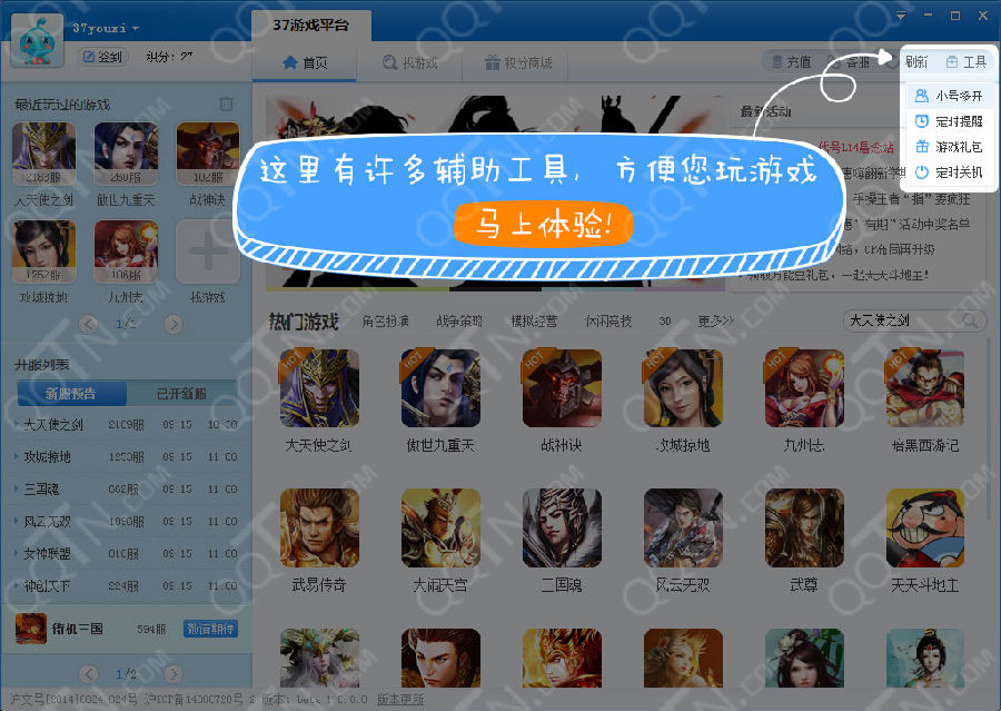 37游戏盒子是国内页游大佬37游戏专为其运营的网页游戏打造的。使用37游戏盒子可以在桌面上登陆37运营的各种页游,并具有小号多开、游戏加速、礼包领取、按键精灵等功能。