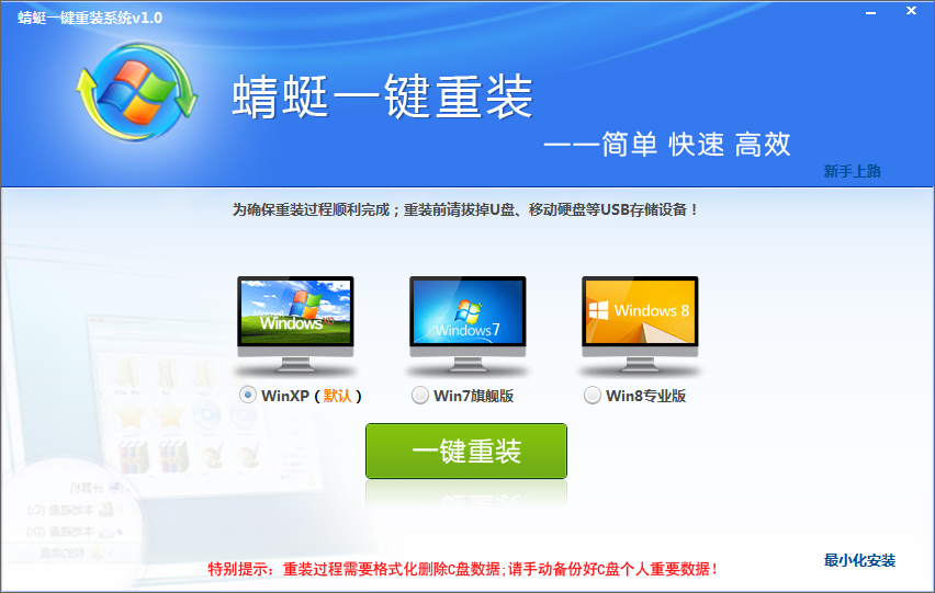 一键重装系统软件操作简单,一键式搞定装机重担。从系统下载到系统安装,一键重装系统工具都全权负责,你只需在一旁玩手机,必要的时候按一下下一步即可。不管事windowsxp、win7、win8还是32位、64位、或是家庭版、旗
