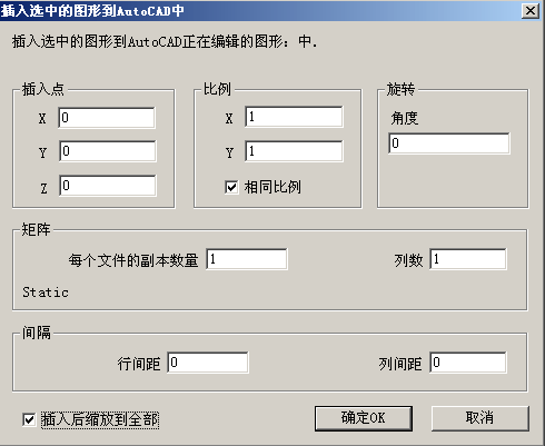 在这个对话框中您可以指定插入点、比例、角度和阵列参数。